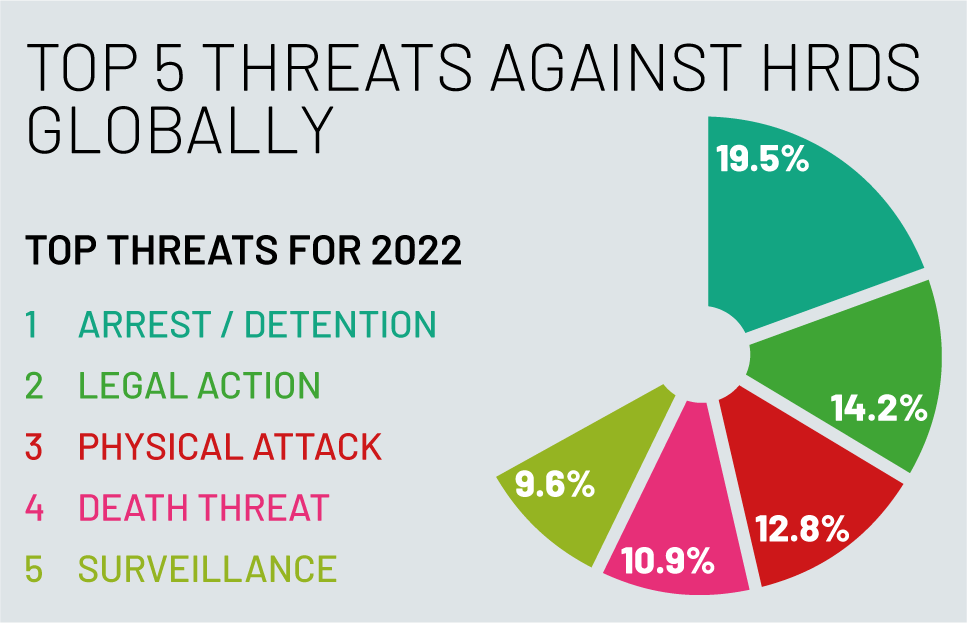 Global Analysis 2022 data is based on more than 1,500 threats and violations reported to Front Line Defenders, and is disaggregated by region, type of threat, sector of human rights work and gender.