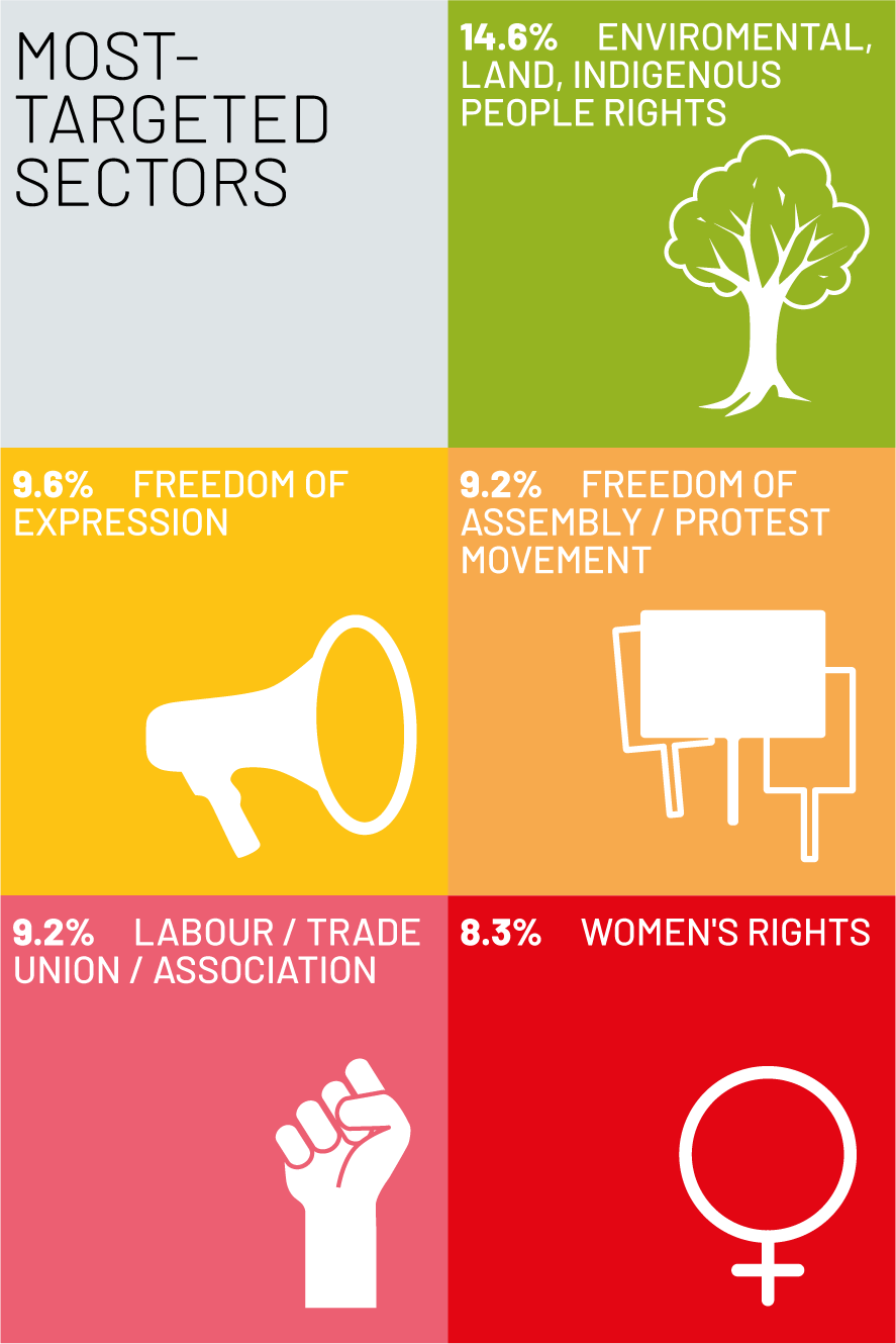 The five most targeted sectors of human rights defence were: environmental, land and indigenous peoples’ rights (11%); freedom of expression (10%); protest movement/ freedom of assembly (9%); women’s rights (7%); and impunity and access to justice (6%).